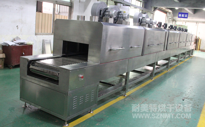 2、外形尺寸(約):總長(zhǎng)14000mm*總高1490mm*總寬1040mm,地面到網(wǎng)帶的高度為850mm,產(chǎn)品傳送帶寬度為600mm,爐體內(nèi)進(jìn)料高度為300mm;烘干部分總長(zhǎng)7500mm,分4段,第一段長(zhǎng)1500mm,后三段各長(zhǎng)2000mm, 冷卻部分長(zhǎng)4000mm,分2段,每段2000mm,爐蓋上加裝0.75KW強(qiáng)力離心風(fēng)機(jī),爐體底部加裝收風(fēng)斗(鍍鋅板烤漆),兩端緩沖部分各長(zhǎng)400mm, 緩沖區(qū)進(jìn)料高度為200mm,各加手動(dòng)調(diào)節(jié)門(mén),進(jìn)料部分長(zhǎng)850mm,出料部分長(zhǎng)850mm , 爐體前后裝有急停開(kāi)關(guān)。